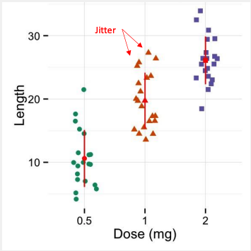 These plots are suitable compared to box plots when sample sizes are small. Jittering is used to separate observations with equal value.