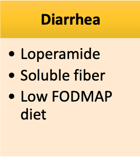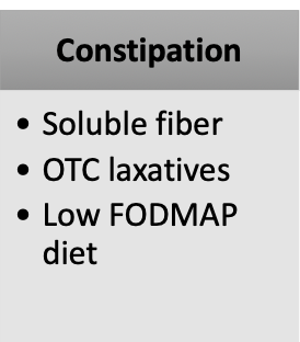 Treat predominant symptoms. Constipation