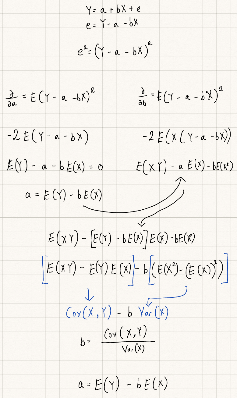 It minimizes mean squared error. Minimizes e = Y - a - bX