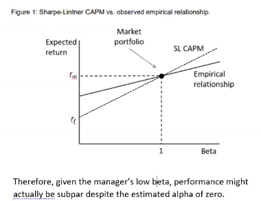 The SML is too flat. On average, portfolios with a low beta have historically had positive alpha’s and for alpha’s its the other way around.