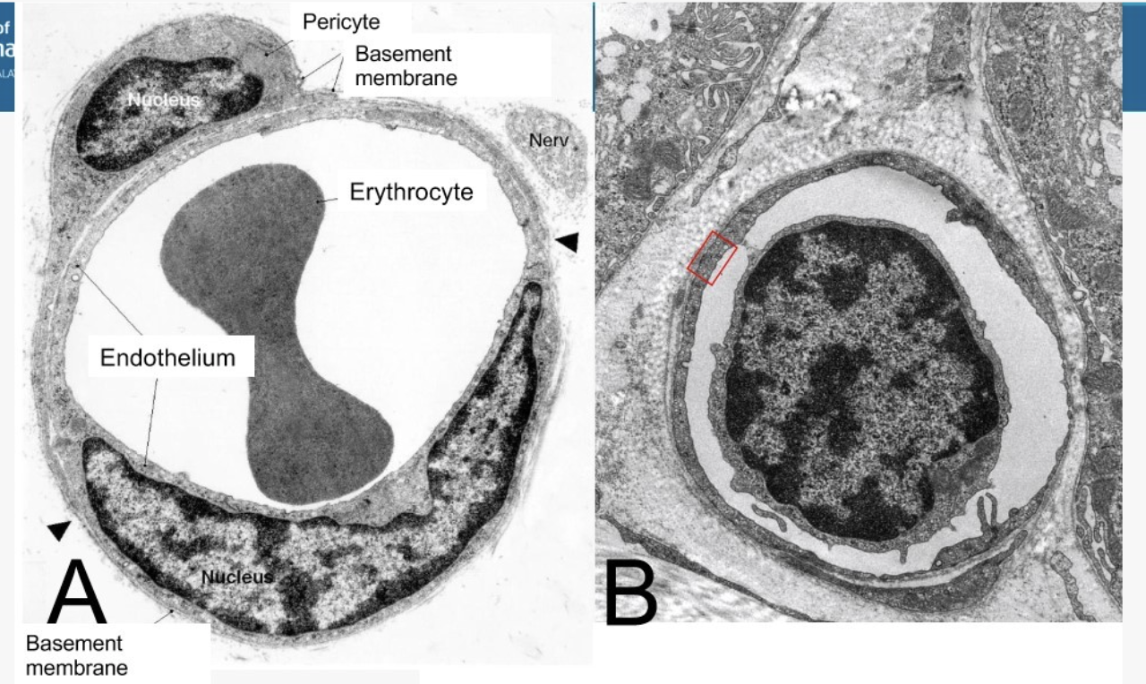Presence of pericyte in A. These cells are crucial for the function of the blood-brain barrier (controls molecular transport between blood & CNS