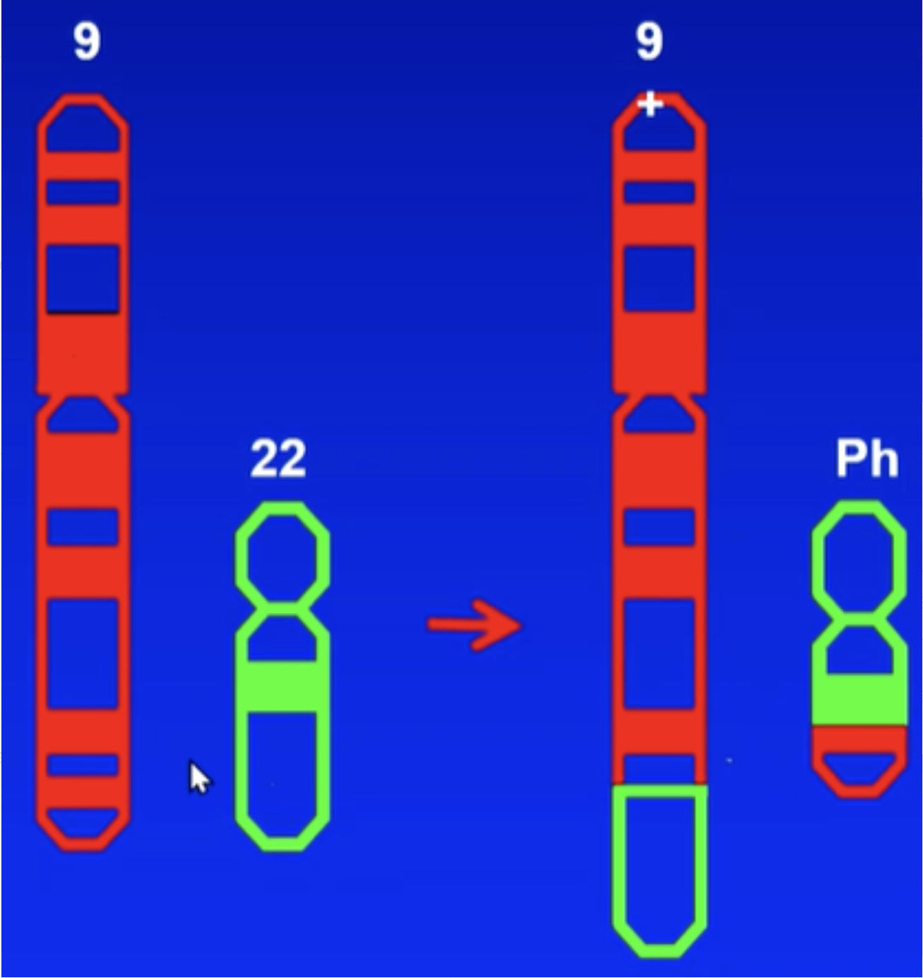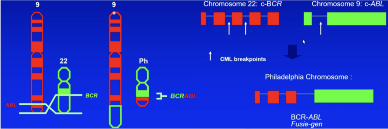 Bij de 9;22 translocatie vindt er altijd een breuk bij introns bij genen BCR (22) en ABL (9) plaats en hierdoor ontstaat op het Philadelphia chromosoom (22) een nieuw fusiegen