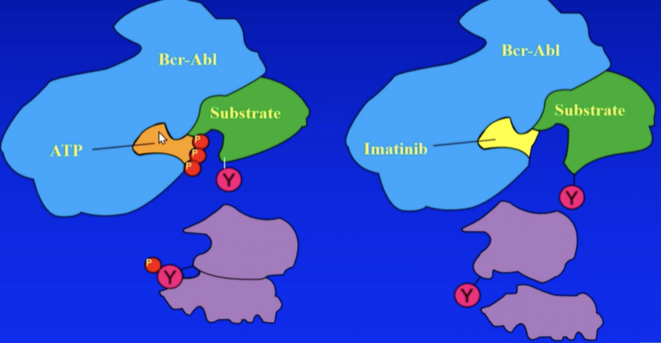 Imatinib (Gleevec): tyrosine kinase inhibitor –> bindt op de plek (pocket) waar ATP in het BCR-ABL eiwit moet binden en inactiveert zo BCR-ABL