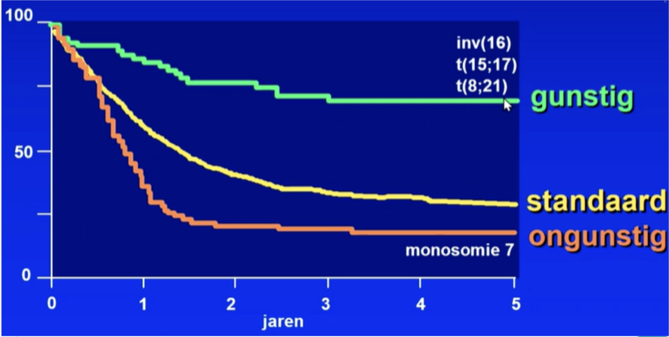 - Translocaties t(8;21) en t(15;17) → goede prognose, behandeling met chemo