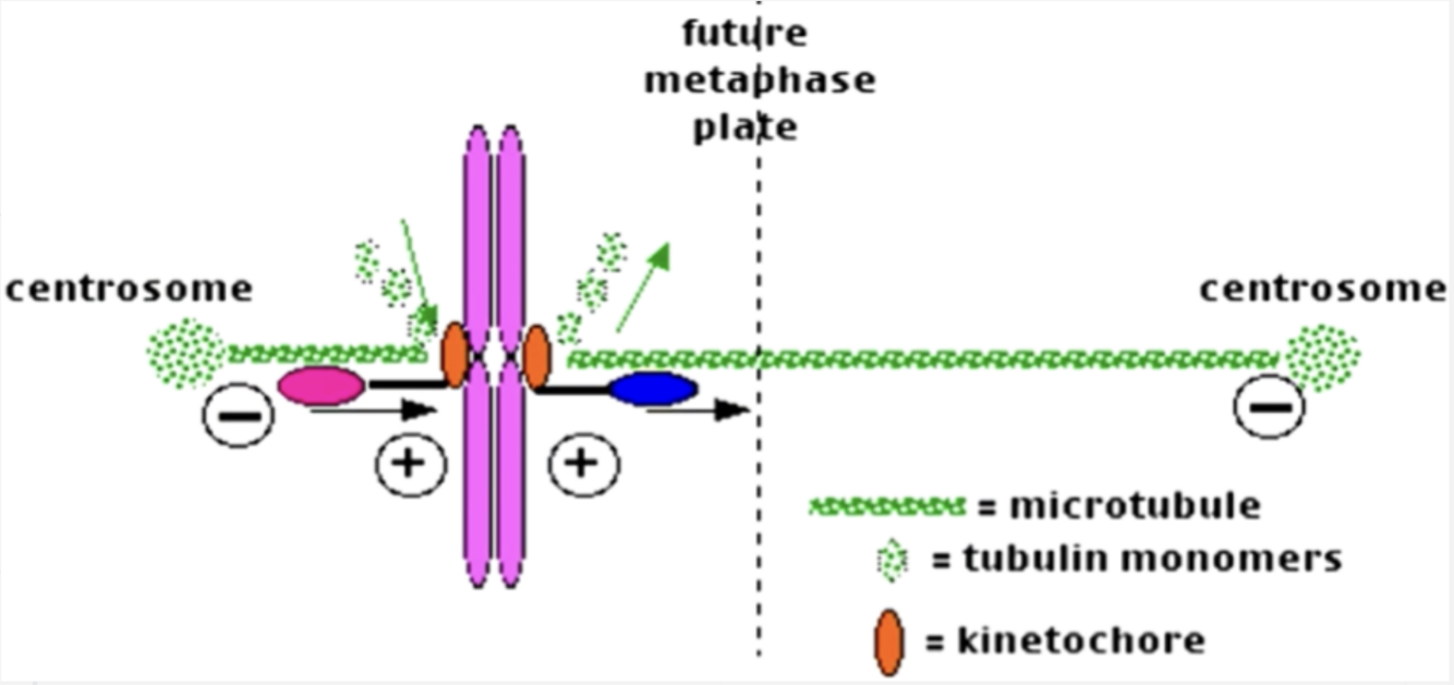 Centrosoom wordt verdubbeld in de S-fase → in de mitose gaan beide centrosomen uit elkaar en verplaatsen zich naar tegenovergestelde polen → vanuit de centrosomen groeien tubuline draden die vastgehecht raken aan de chromosomen (kinetochoor) → hierna kan de anafase beginnen