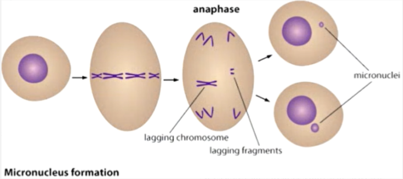 Eerst een dubbelstrengs breuk in het DNA, hierna gaat het de mitose in; chromosomen worden netjes uitverdeeld alleen het deel aan de centromeer wordt netjes uitgelijnd terwijl het andere stukje niet verdeeld wordt (komt ergens middenin de cel terecht) –> na de mitose zal dit stukje in het cytoplasma van 1 van de dochtercellen circuleren en daar zal een micronucleoli (microkern) omheen gevormd worden –> meestal gaat het stukje hierna helemaal verloren