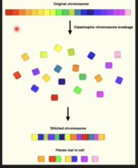 Chromosomen breken in kleine stukjes en worden weer aan elkaar gezet in de verkeerde volgorde –> hierdoor meerdere transversies in 1 cel (vergevorderd stadium van kanker)