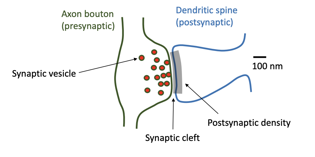 Sketch the structure of a chemical synapse. Indicate relevant length scales.
