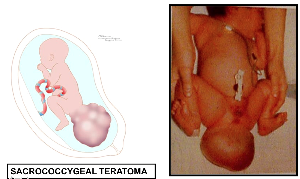 Sacrococygeal teratoma=tumor. Forms when primitive streak fails to recede. Pluripotent cells, so inside tumor there are all tissue types. Surgically removed after birth. Typically benign, but can develop to become malignant. happens in 1/35,000 births. Most common form of cancer in newborns.