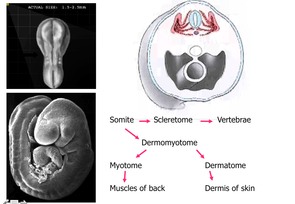 Paraxial mesoderm makes blocks of tissue (somites) form caudally ~44 pairs of somites after somatogenesis