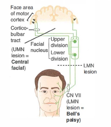 Lower motor neuron lesion - Ipsilateral paralysis of the lower AND upper face.