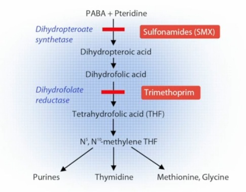 Both inhibit tetrahydrofolate (biological active form of tetrahydrofolic acid (THF)) synthesis, bacteria can’t make Thymidine and make DNA, they can’t replicate. Bacteriostatic.