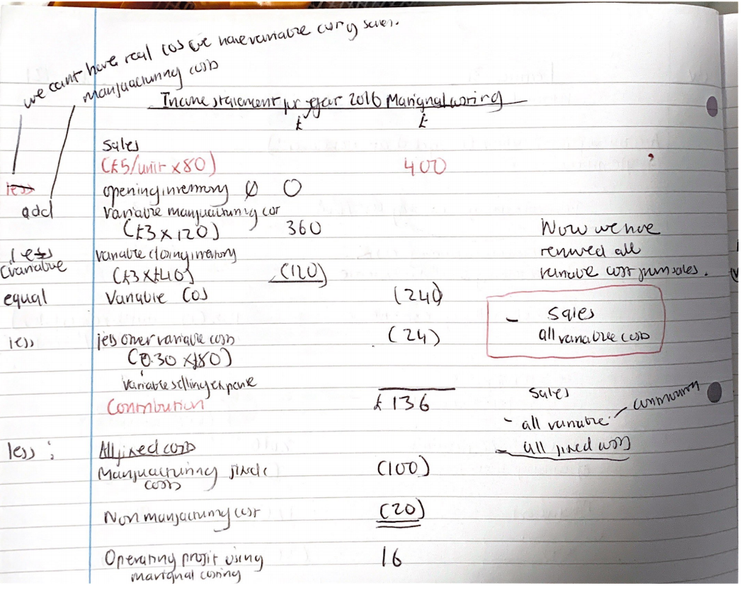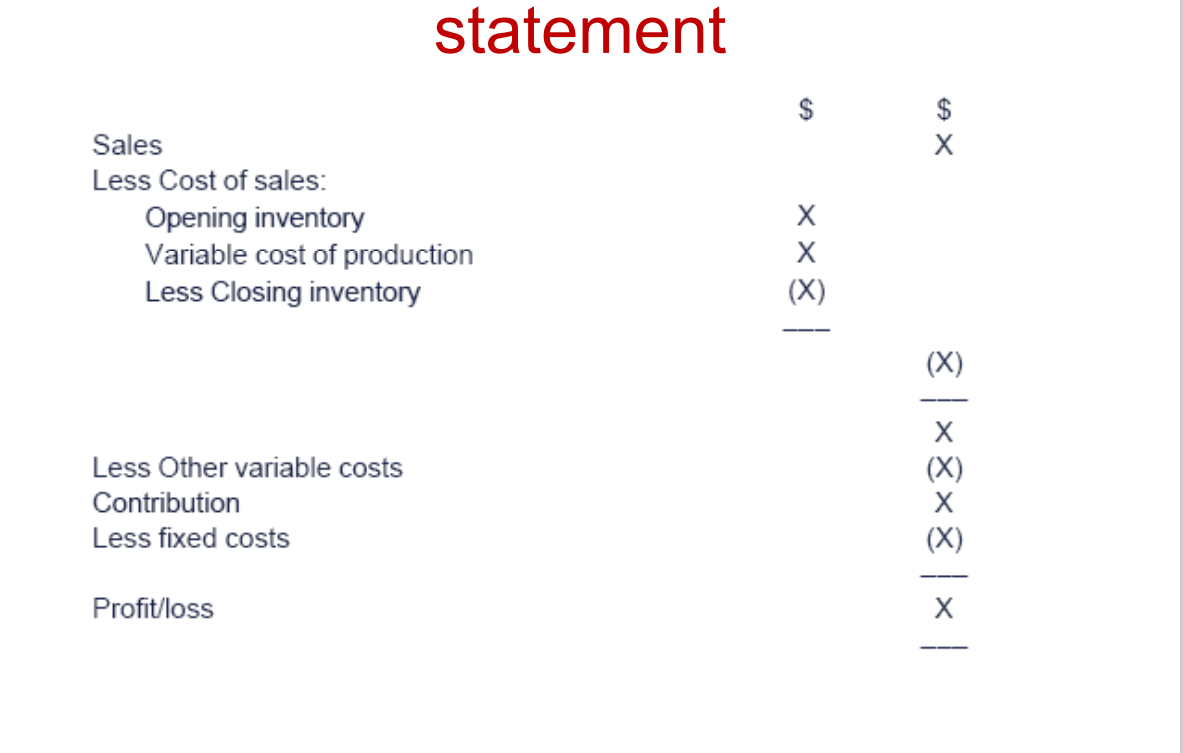 The aim is to reach a figure called contribution, so in traditional income statement you have revenue - cost of sales = gross profit - expenses to get operating profit. Under marginal costing we want to sepatate the fixed cost from variable cost.