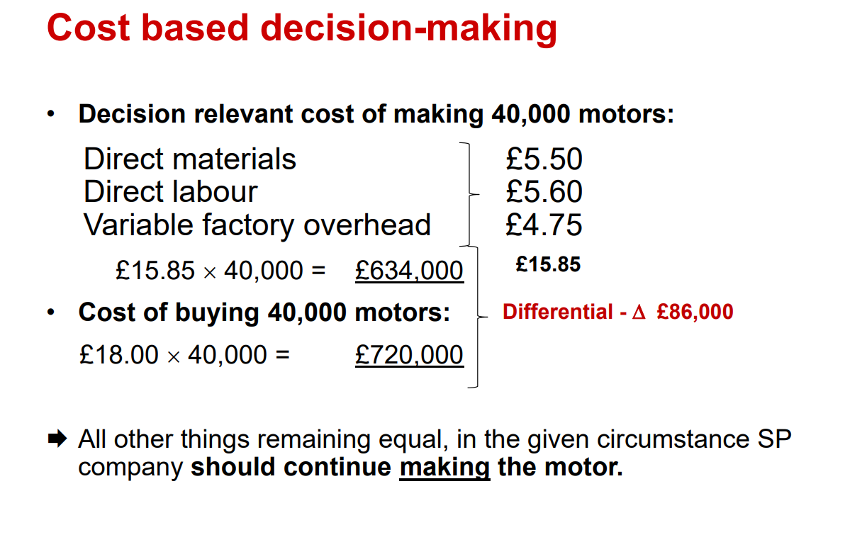 In January 2018, an outside supplier offers to supply a comparable motor to SP Company for £18 (incl. delivery). The price will be guaranteed for one year if SP company signs the contract by 28th February with delivery of the product starting soon after. Should SP (1) Make or (2) buy the motors?