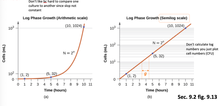 Log phase: period of balanced growth, exponential inc in number of living bac cells