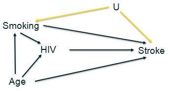 Als we het directe effect van HIV op stroke willen weten; is het een probleem dat we voor U niet kunnen adjusten (het is een unmeasured confounder)?