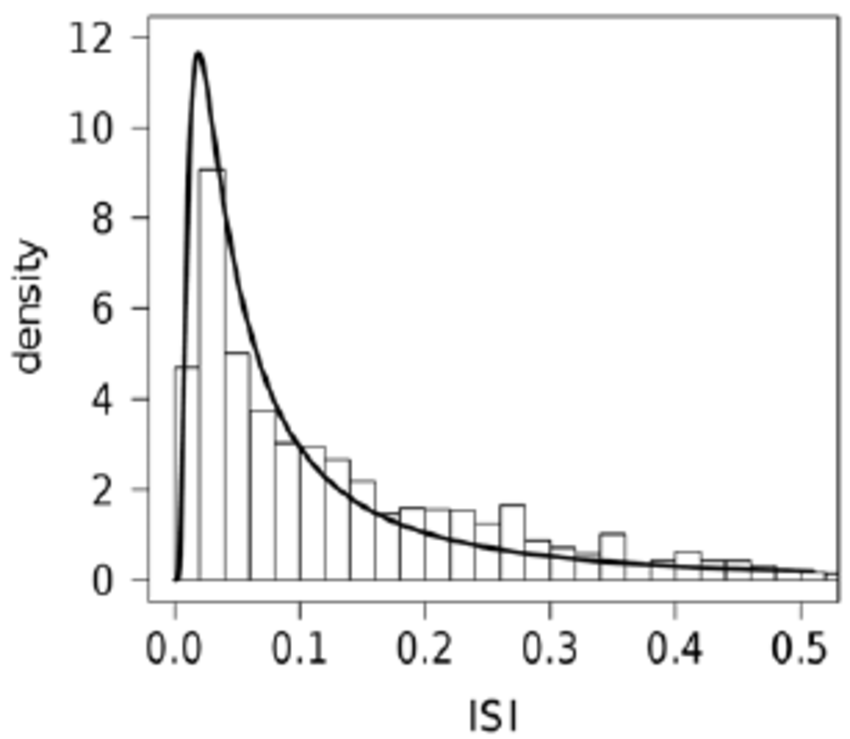 The neuronal firing depicted in this histogram appears to be regular, there is one clear peak of preferred interspike interval.