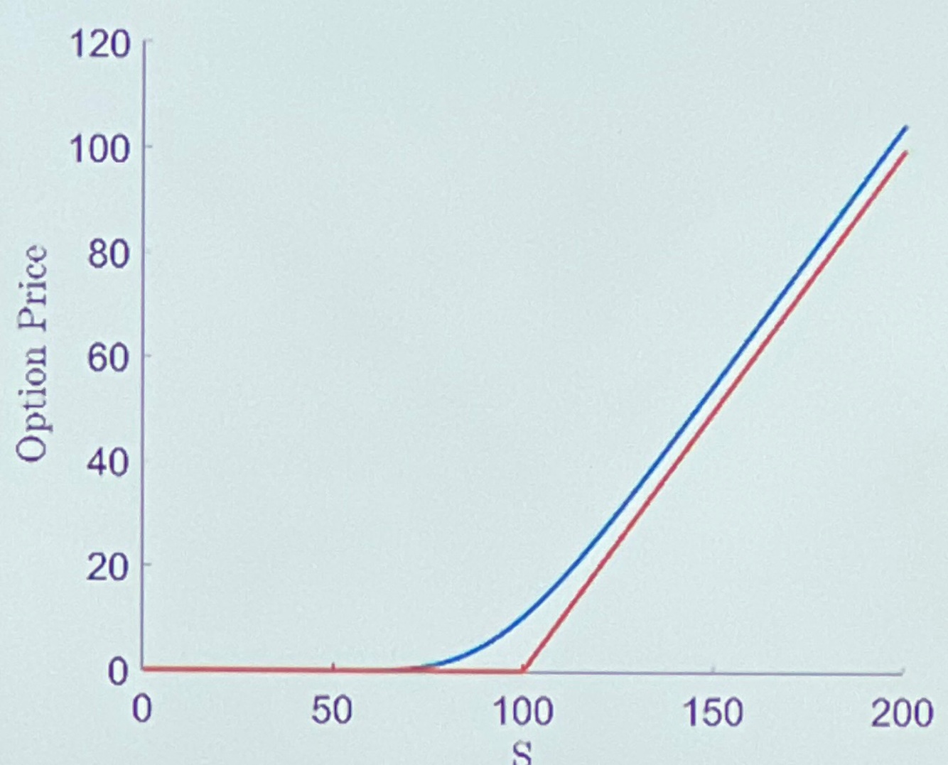 Typical graph of call option value against intrinsic value