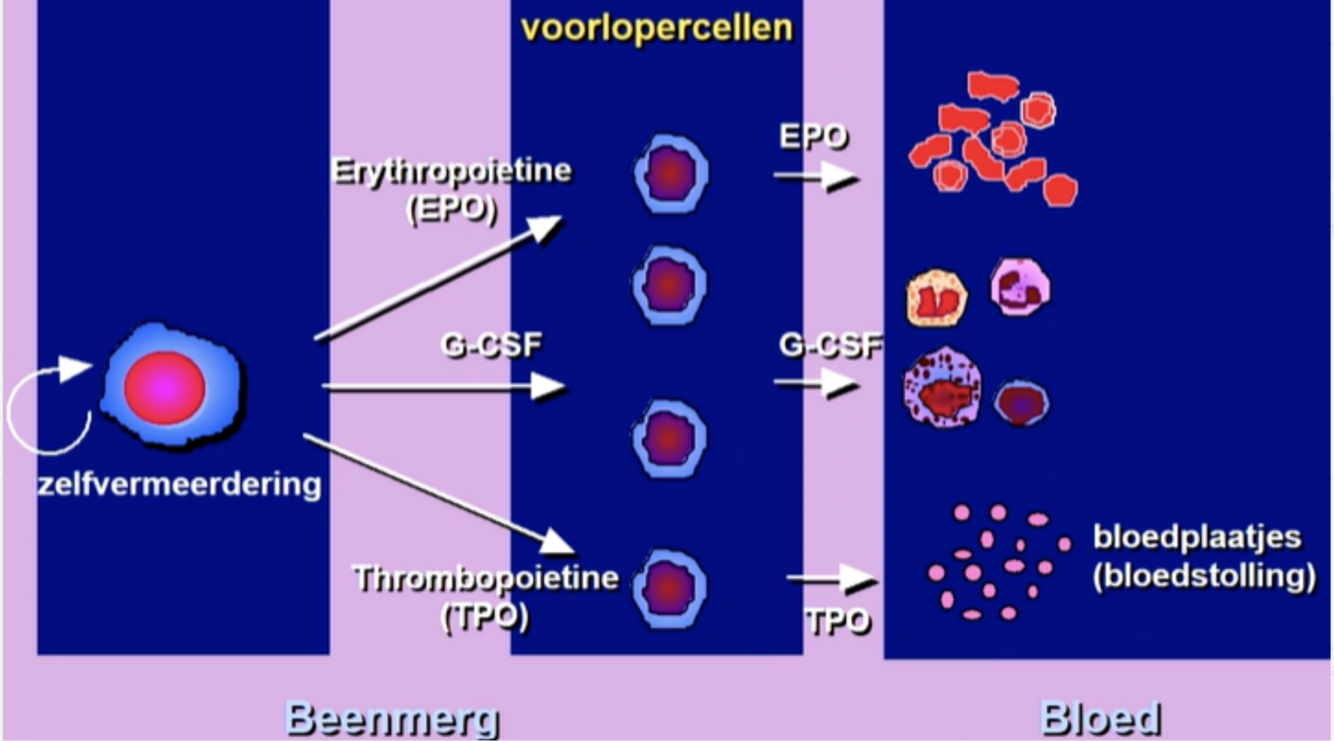 Alles ontstaat uit pluripotente stamcellen in het beenmerg en o.i.v. hematopoëtische groeifactoren kunnen ze prolifereren en uitrijpen naar functionele bloedcellen