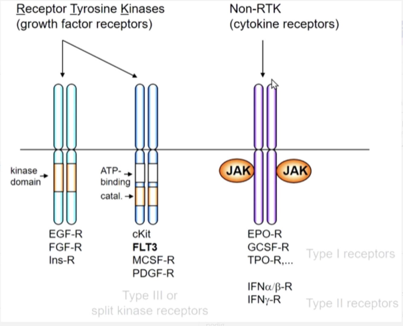 - NON-RKT: zelfde proces als andere receptoren alleen heeft de receptor zelf geen kinase activiteit, maar zit er enzymactiviteit (JAK tyrosine kinase) gekoppeld aan het intracellulaire domein