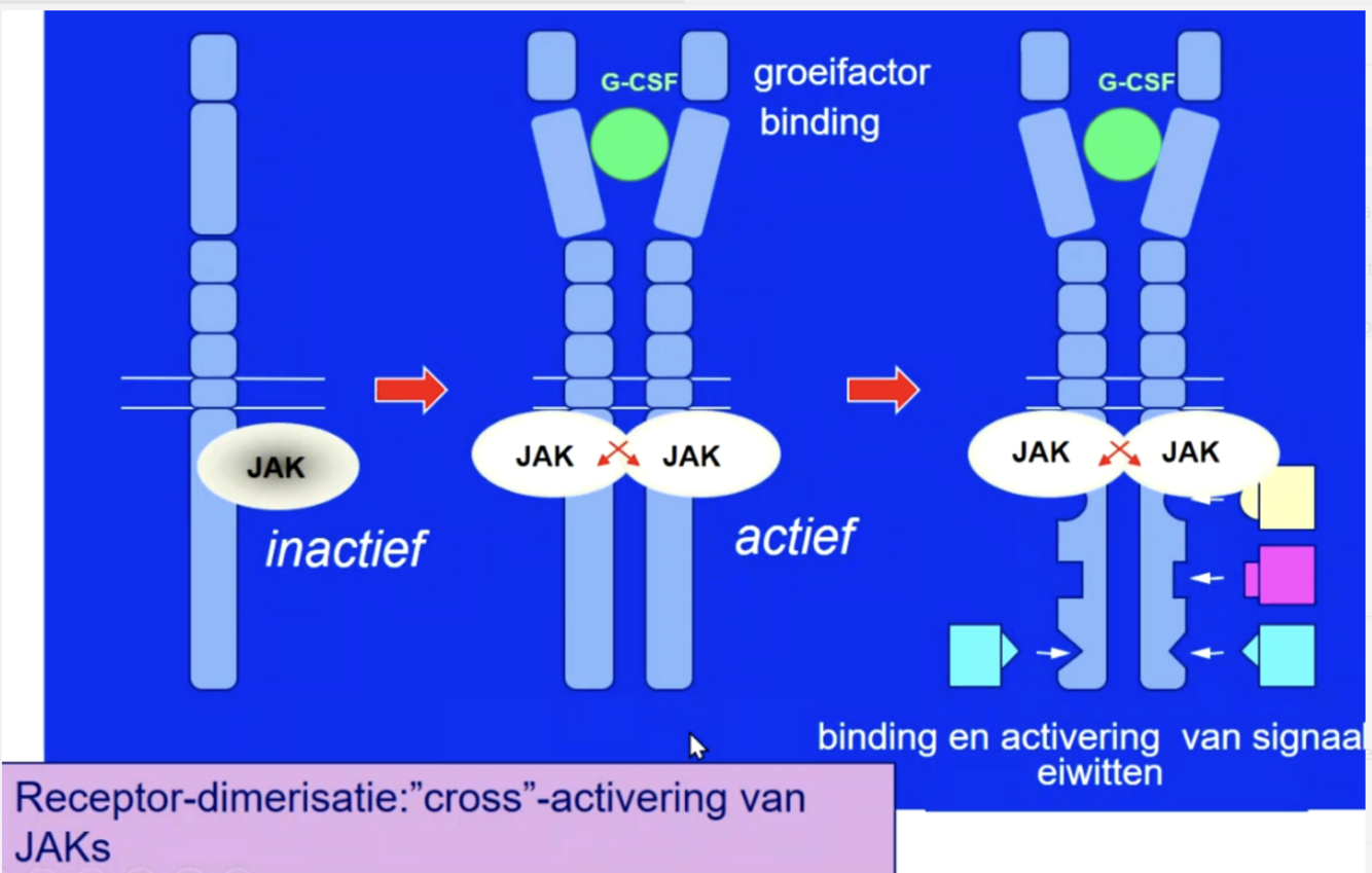 1. Als G-CSF aan de receptor bindt wordt een homodimeer gevormd waar aan de ketens JAK kinase zit gebonden