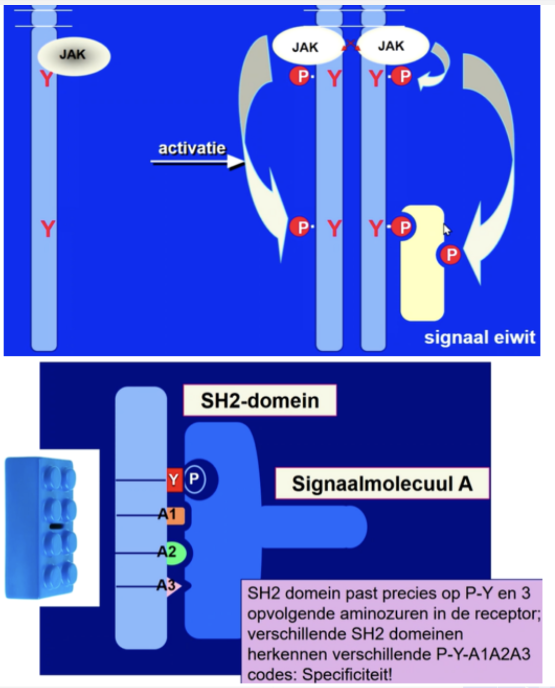 2. C-terminaal (onder gefosforyleerde tyrosine) van het SH2-domein zitten nog 3 aminozuren die een unieke code vormen waardoor het signaalmolecuul wel/niet kan binden (verschillende P-Y-A1A2A2 codes) wat zorgt voor specificiteit