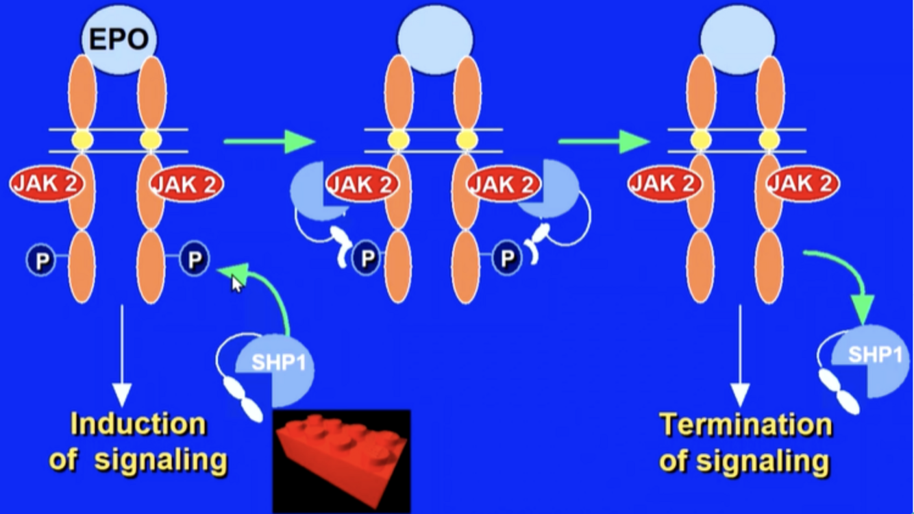 Gefosforyleerde tyrosine in een geactiveerde receptor vormt een interactie met het SH2-domein –> vorming specifieke bindingsplaats voor phosphatase (SHP-1) –> specifieke binding aan het SH2-domein met tyrosine –> ontvouwing phosphatase en fosfatase activiteit deactiveert JAK-kinase