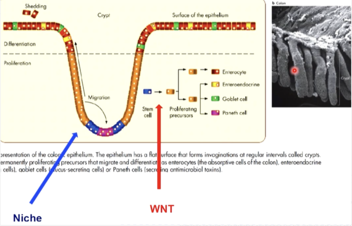 Constant celvernieuwing vanuit de stamcel pool onderin (elke 7 dagen complete vervanging), WNT-gradiënt aanwezig die afneemt richting het darmoppervlak omdat het alleen voor stamcellen belangrijk is