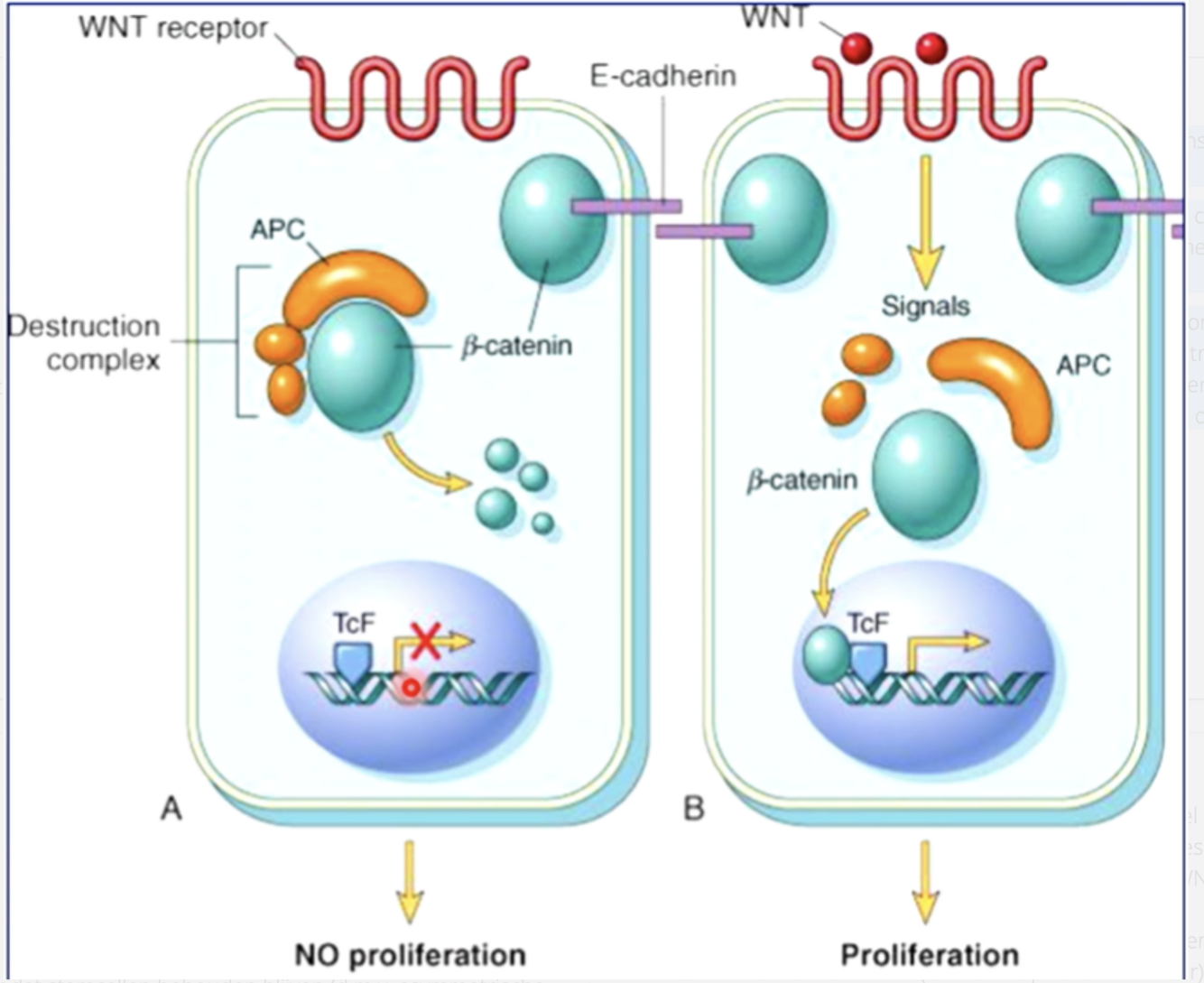 Als WNT niet bindt aan de receptor: bèta-catenine bindt aan cytoplasmatische deel E-cadherine en zorgt voor stabiliteit, ook binding aan APC (samen met axine en GSK) en vormt zo een destructiecomplex wat bèta-catenine afbreekt