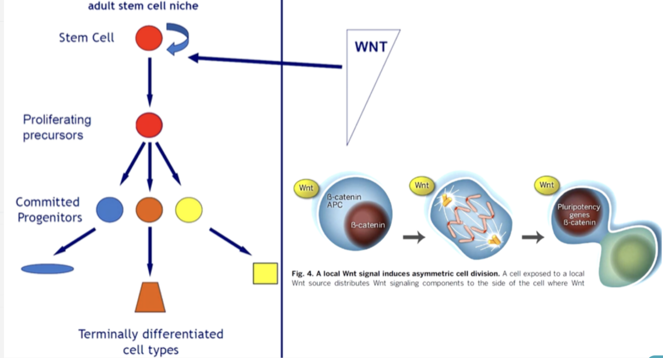 Stamcellen delen asymmetrisch: 1 ontwikkelt zich tot stamcel (dichtste bij Paneth cel), ander verliest het vermogen om WNT target genen tot expressie te brengen en is geen stamcel meer, hij zal opschuiven en door de steeds lagere WNT-factor zal hij uiteindelijk stoppen met delen en volledig differentiëren