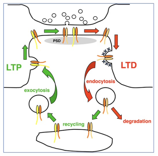AMPARs diffuse in the membrane around the synapse. Some AMPARs