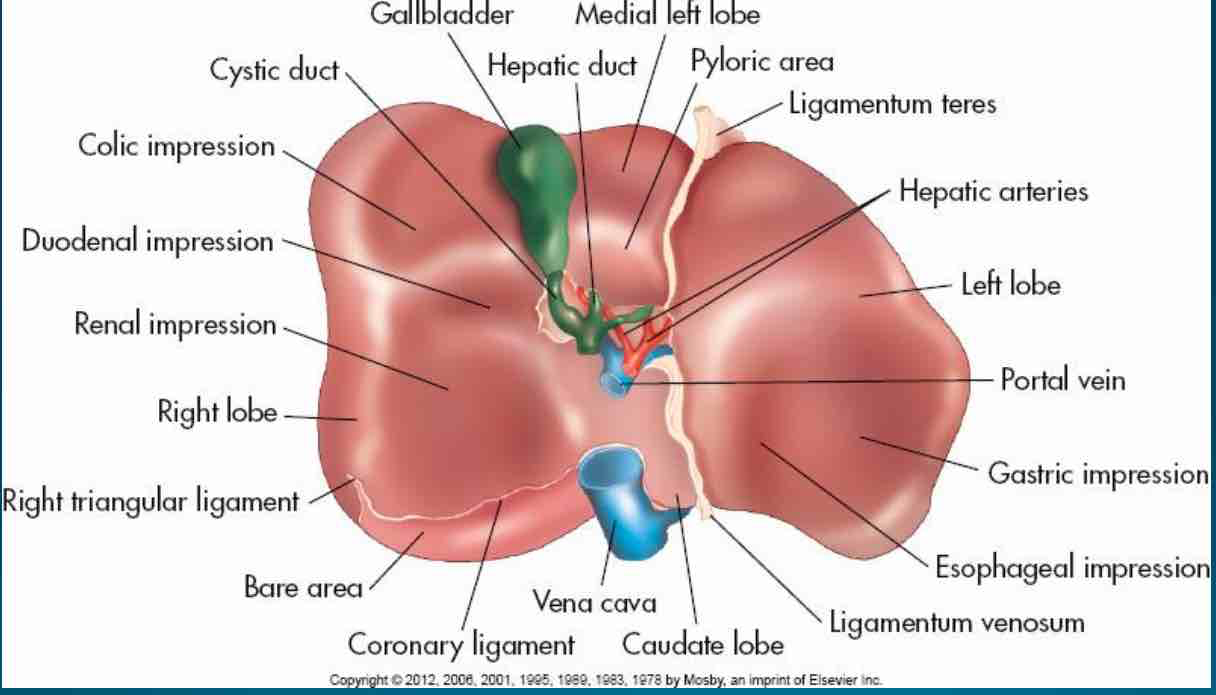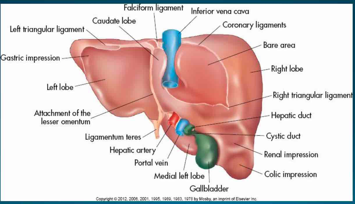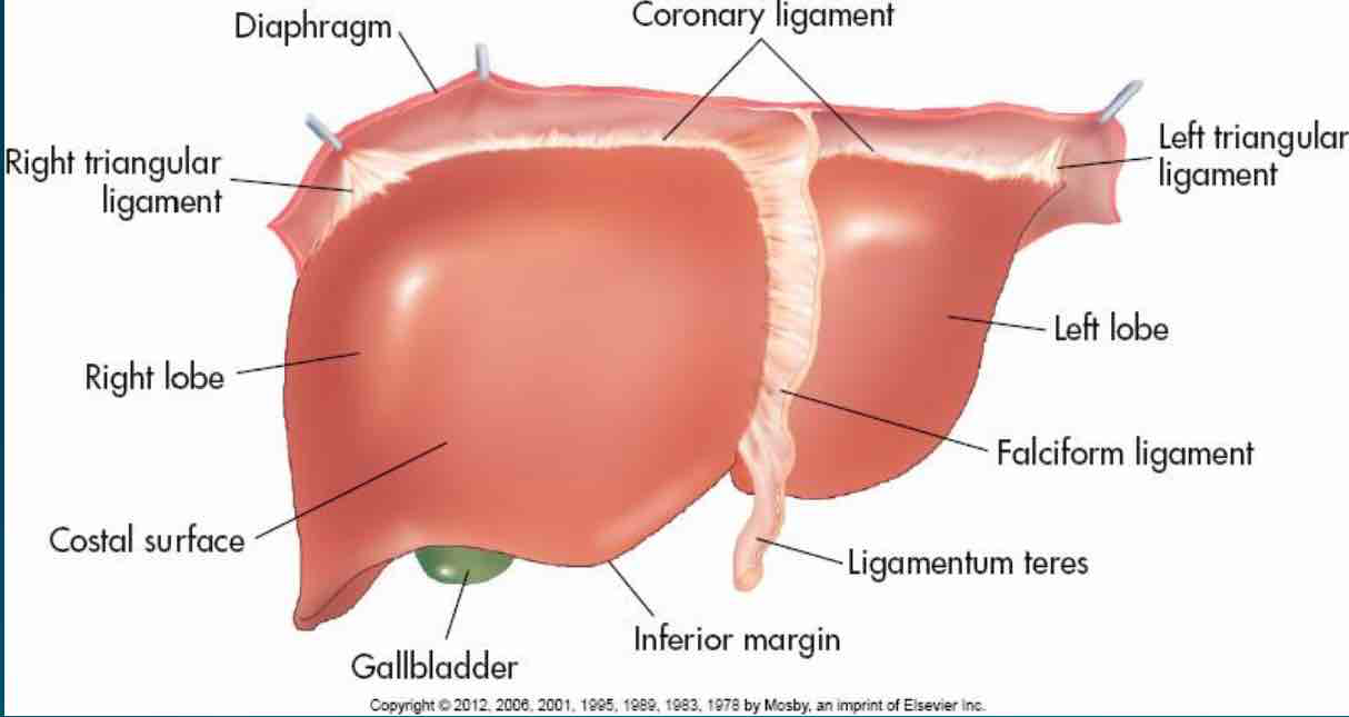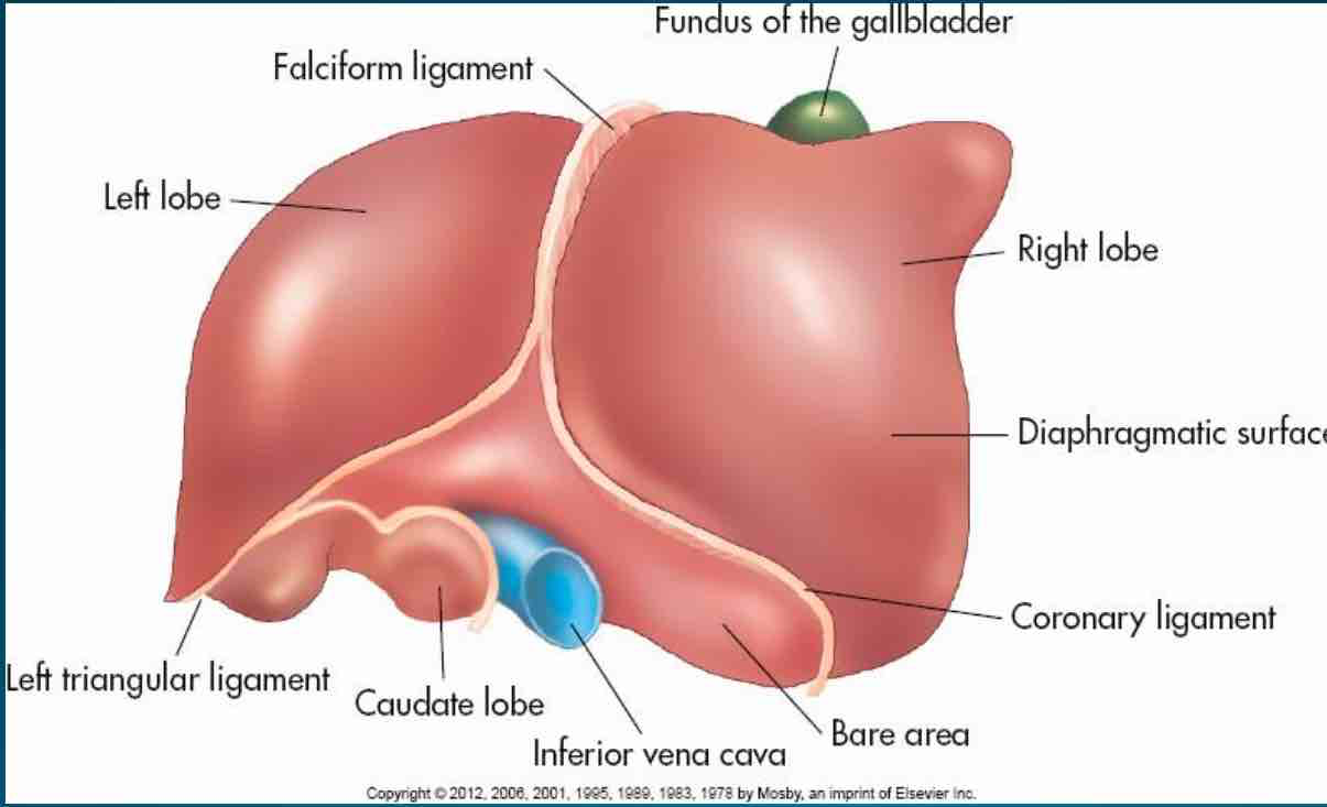 The right lobe of the liver is located posteriorly to the