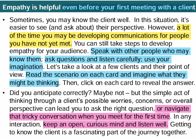 referring to empathy, can it be useful even before your first meeting with a client? what do u have to do when developing communications with people you haven’t met yet?