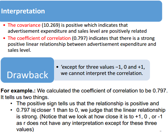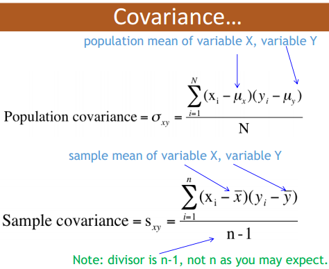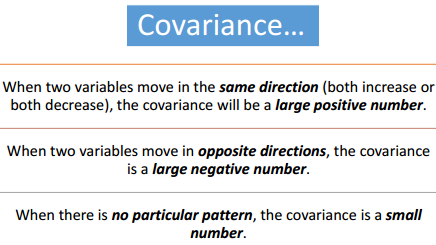 1/ Covariance: Describes the direction of the relationship between two variables.