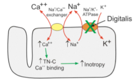Drugs digoxin increase the force of heart muscle contraction (ionotropy) and are used in teh treatment of congestive heart failure.