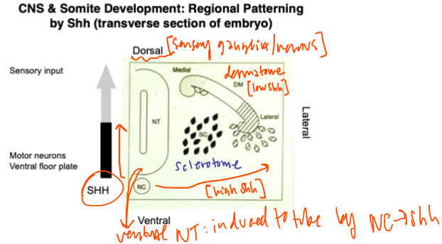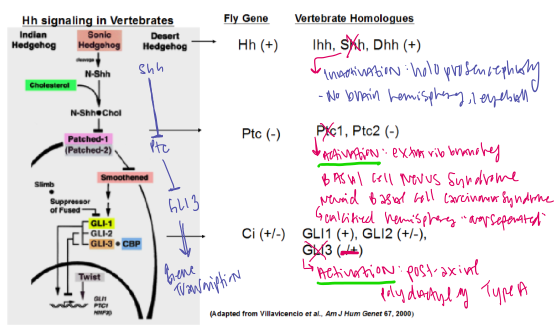Pathway activation (removing brakes on GLI): extra rib branches, asal cell nevus syndrome, verboid basal cell carcninoma syndrome (calcified hemispheres of brain, overseperated)