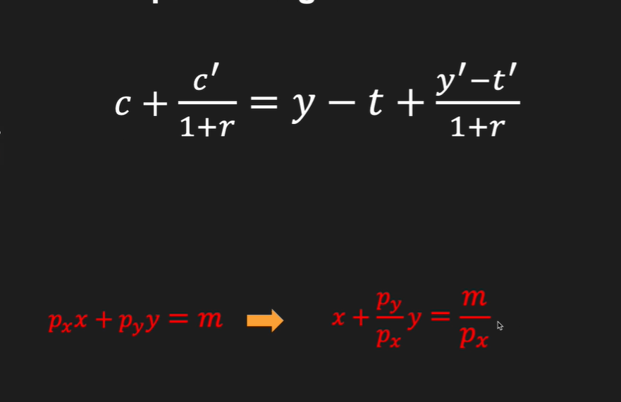So i have 2 goods C and C’, the relative price of the 2 goods is c’/1+r and the income in terms of how many consumption goods of x i can buy = the right handside of the intertemporal budget constraint.