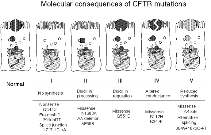 CFTR mutations: nonsense, block in processing deltaF508 (70%), regulation block, altered conductance, reduced synthesis