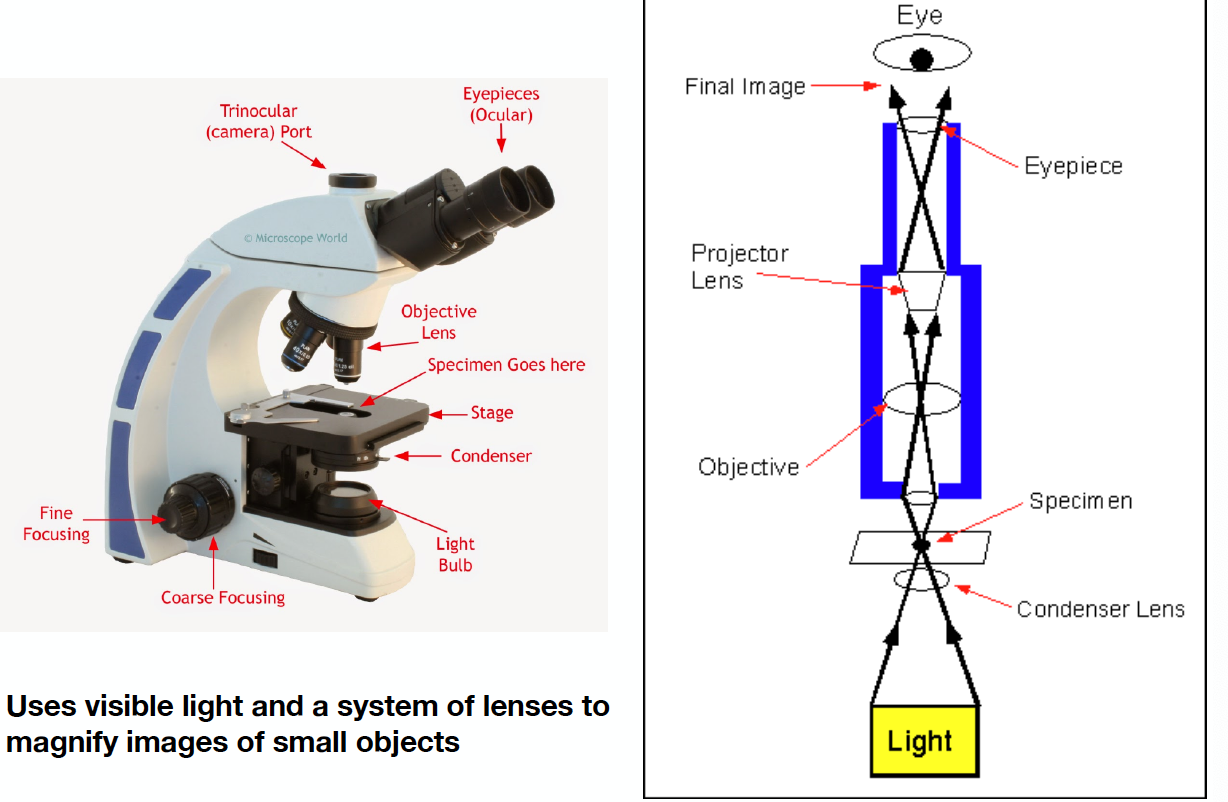 uses visible light and a system of lenses to magnify images of small objects