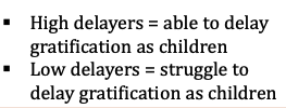 Design: A child is offered one marshmallow now or two if they wait (~15 minutes) without eating the first.