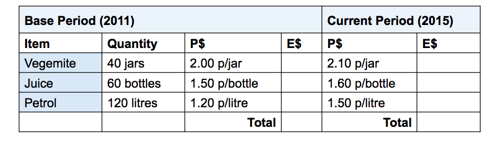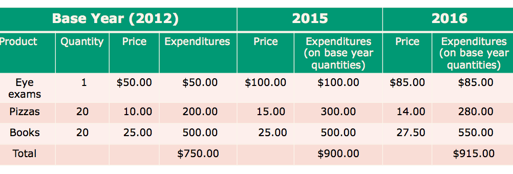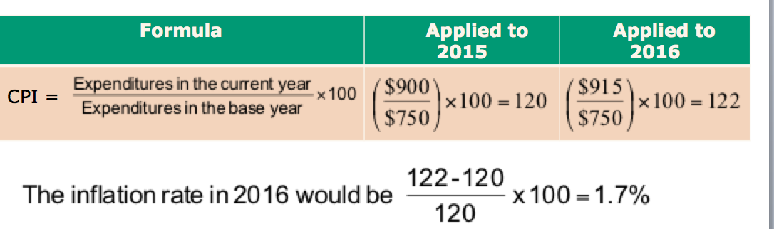 CPI = expenditures in current yr/ expenditures in base yr x 100