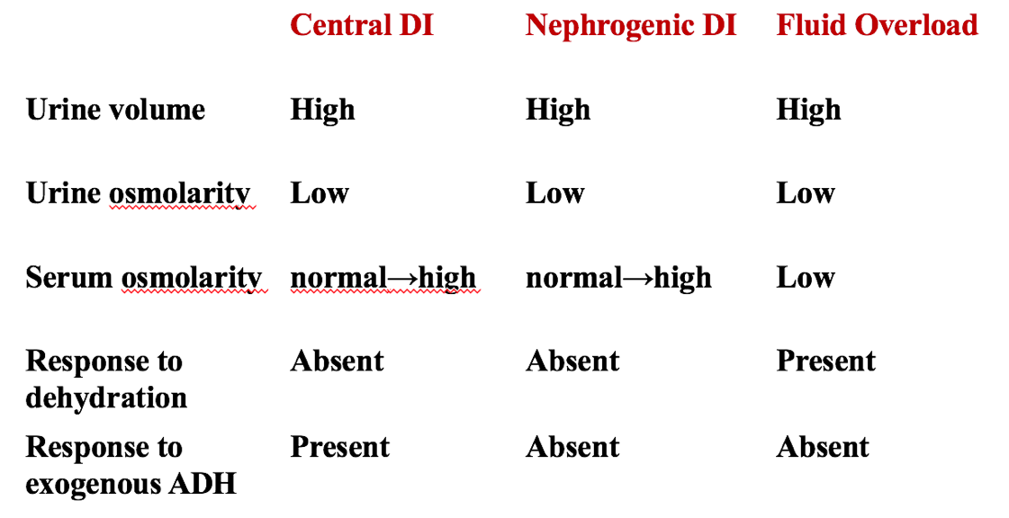 For the following conditions, provide urine volume, urine osmolarity, serum osmolarity, respose to dehydration, response to exogenous ADH: