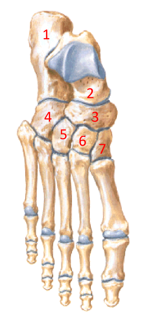 1-Talus 2-Calcaneus 3- Navicular 4- Cuboid 5- Lateral cuneiform 6- Middle cuneiform 7- Medial cuneiform