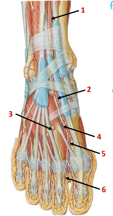 -sural: supplies sensation to dorsal part of 5th digit -superficial fibular: supplies sensation to lateral portion to midline of anterior leg, dorsal part of digits 1-4 -deep fibular: sensation to web between 1st and 2nd digit (extensor digitorum brevis and extensor digitorum longus)