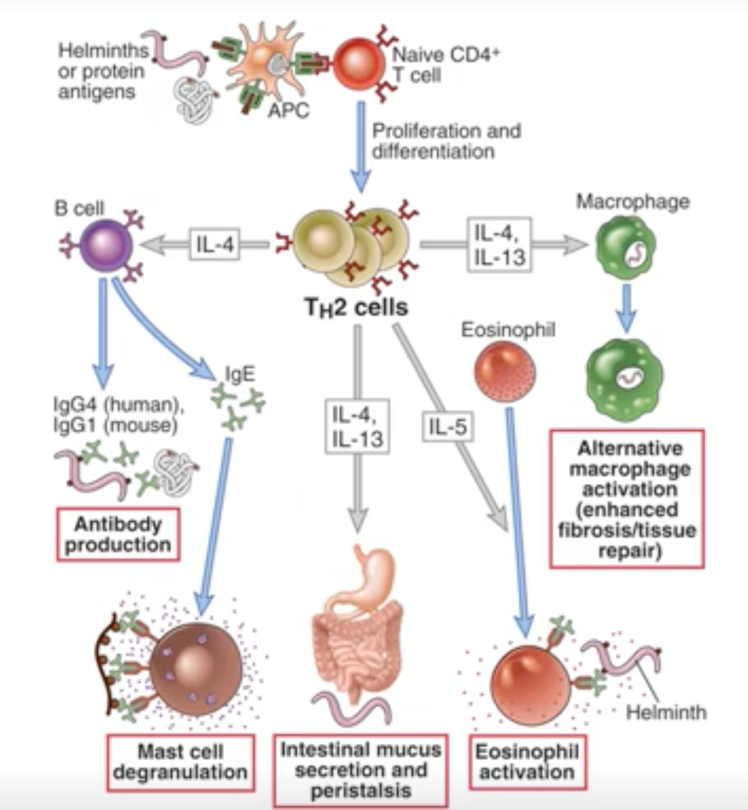 2. Th2 cells secrete IL-4 -> drives B cells to switch isotype and secrete IgE
