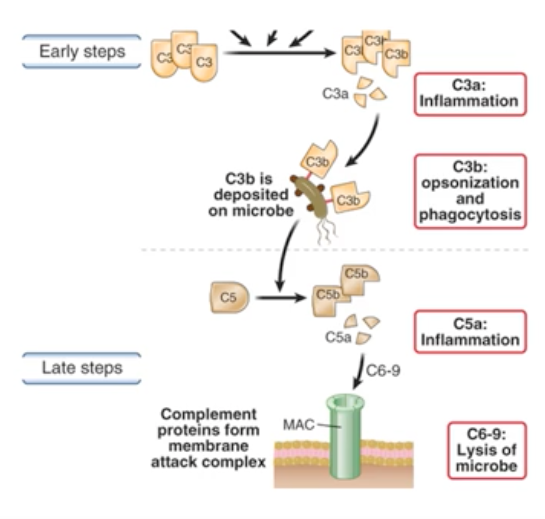 Complement proteins are proteases which cleave on another to form the complement cascade -> inflammation, opsonisation and bacterial lysis