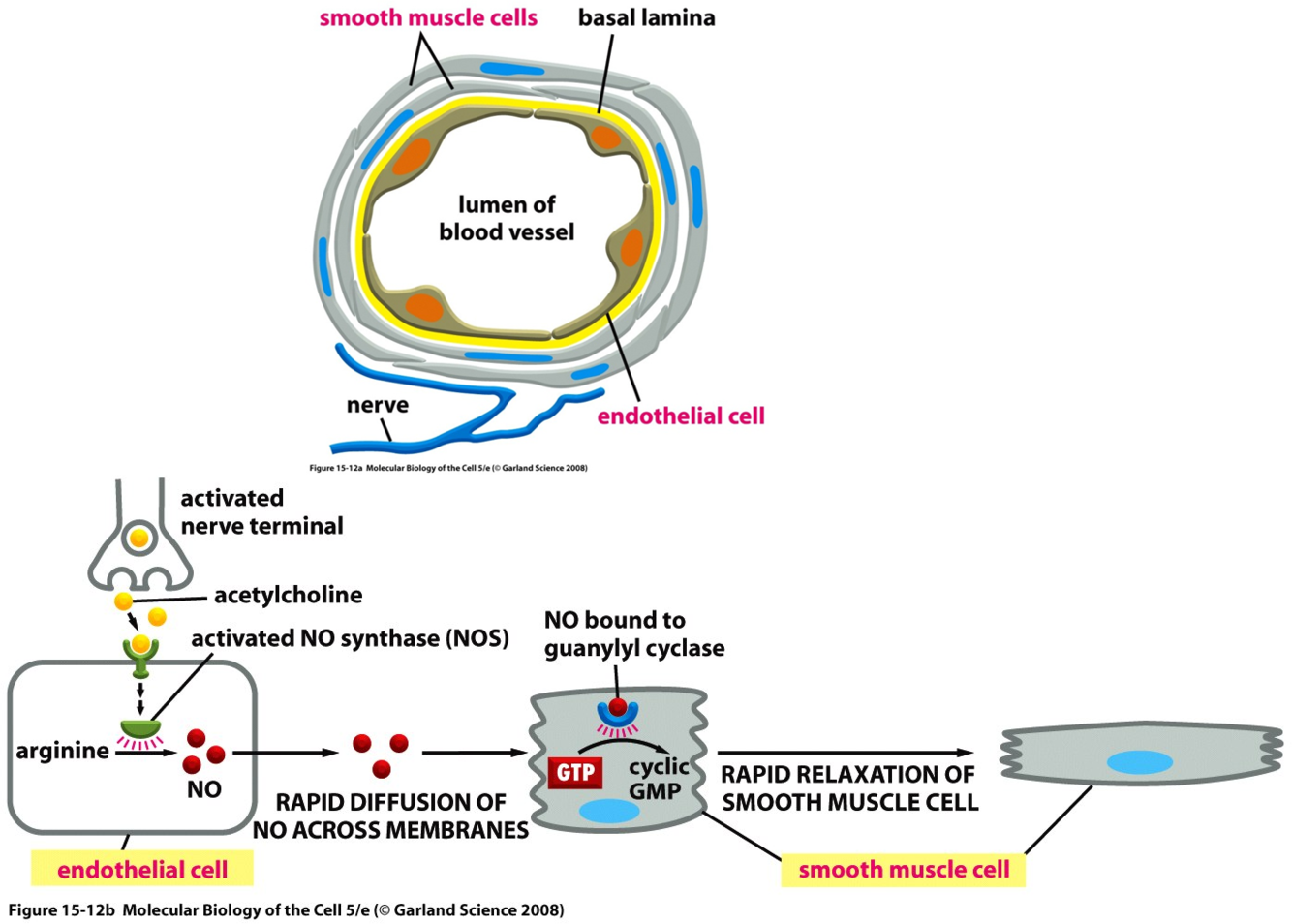 NO diffusion goes to smooth muscle cell activates to gyanylyl cyclase ->