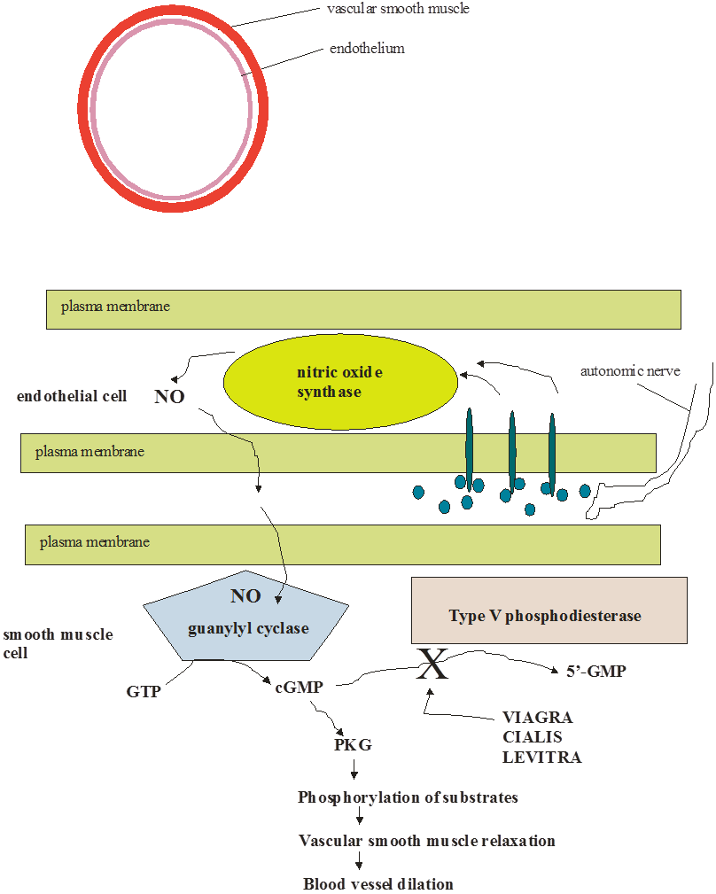 Activation of PKG (phosphorylation) to vascular smooth muscle relaxationand blood vessel dilation