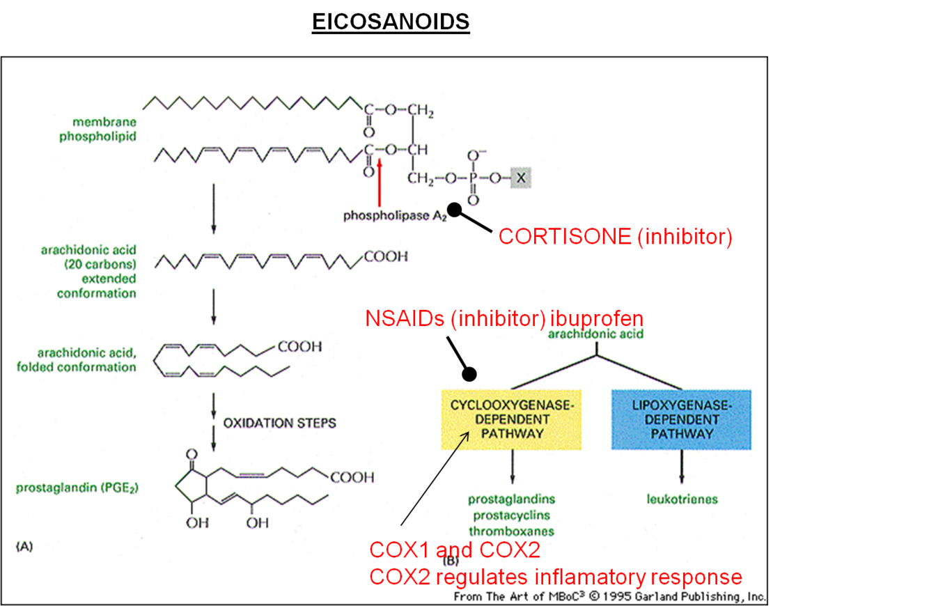Inhibitors of eicosanoids include cortisone and Nonsteroidal anti-inflammatory drugs (NSAIDs) like ibuprofen