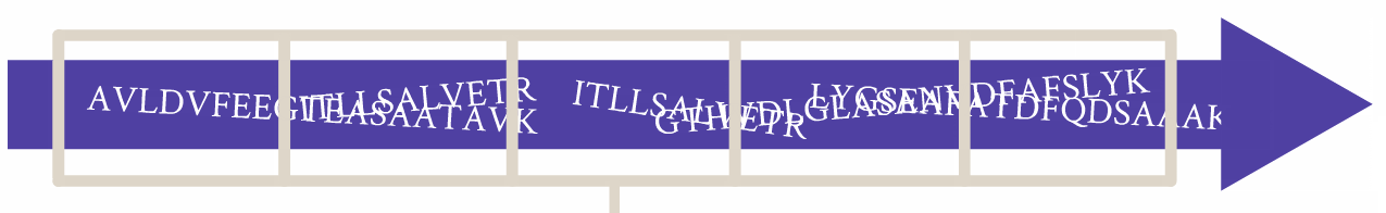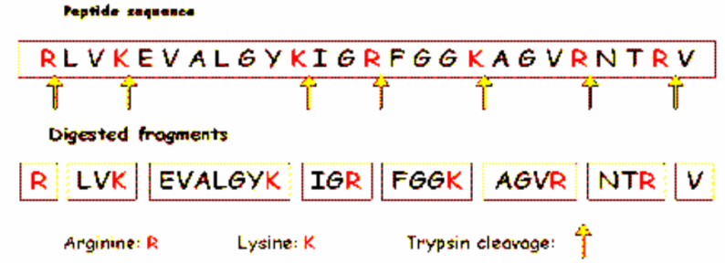 Example; we have a protein sequence and TRYPSIN is cutting up to smaller peptides, typically these peptides are in the region of 4 – 30 amino acids in length, which is “just the kind of mass” to be analysed in mass spectrometry.